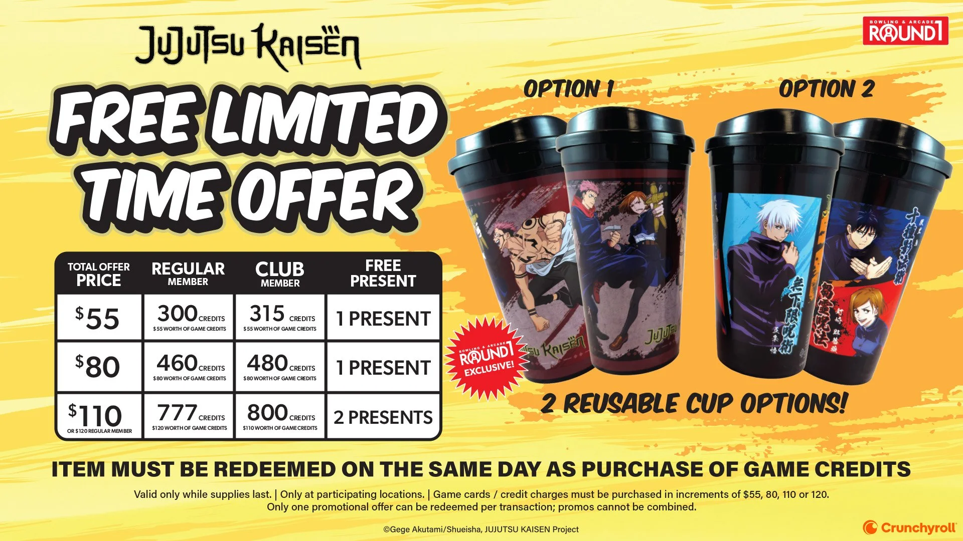 Get your game card and charge $55 or more game credits today at Round1 near you for your free Jujutsu Kaisen special design reusable cup!
