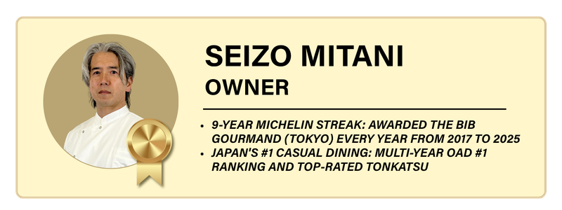 Tonkatsu narikura is one of the most decorated restaurants in all of Japan. Founded by Seizo Mitani after 11 years of training at one of Tokyo's most respected tonkatsu restaurants and five further years studying kaiseki and traditional Japanese cooking, the restaurant opened in 2010 with a single, demanding mission. To redefine what a pork cutlet could be.