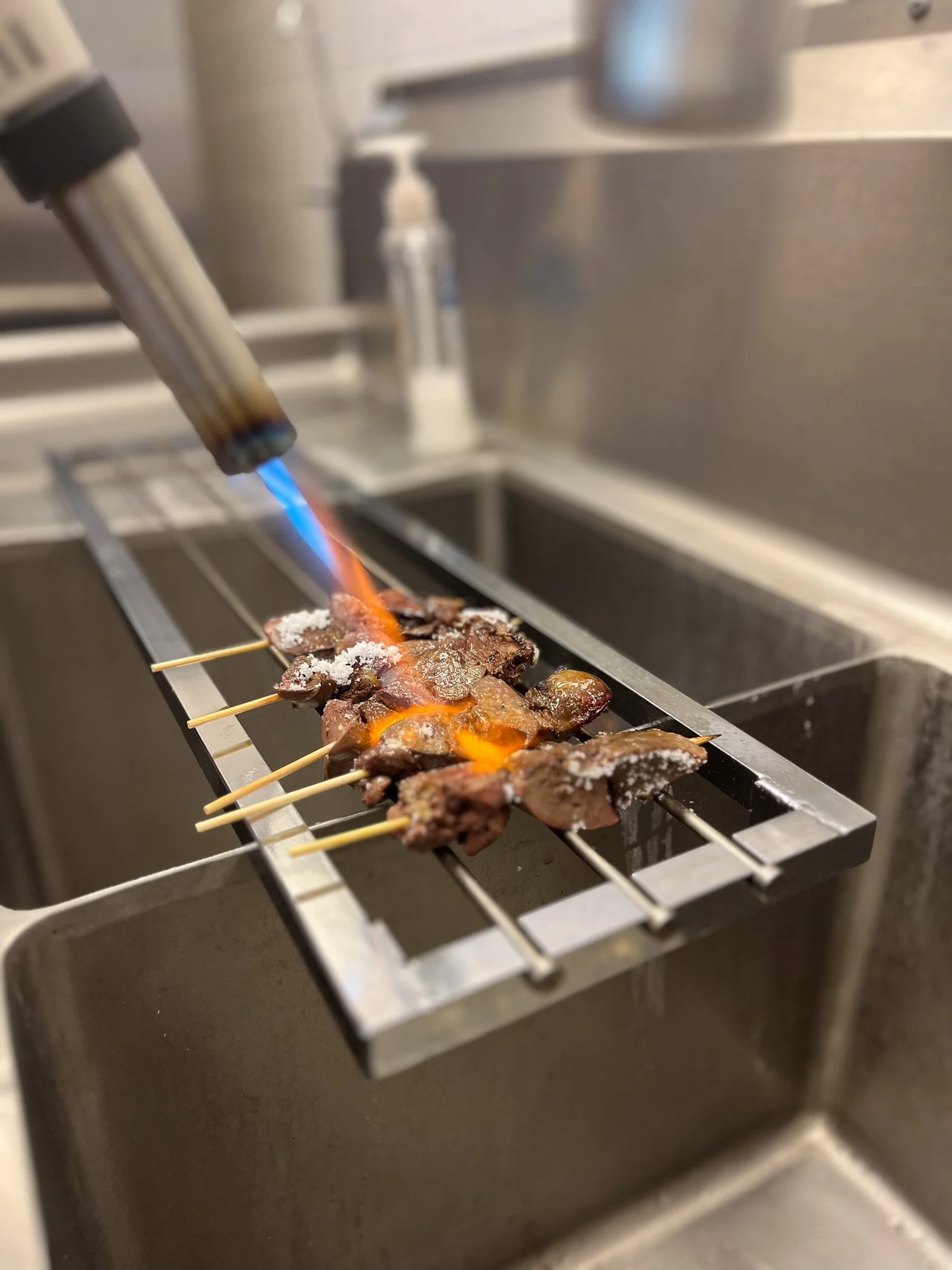 The result is yakitori (Japanese skewered grilled chicken, traditionally cooked over charcoal) that refuses to stay within conventional boundaries. At Yamato, cross-genre inspiration shapes the menu. Skewers feature unexpected ingredients rarely seen in traditional yakitori, such as balsamic vinegar glazes, crushed cookie toppings, and apple with cinnamon. These combinations are not novelties. They are deliberate compositions designed to engage all five senses through flavor, aroma, texture, and presentation.